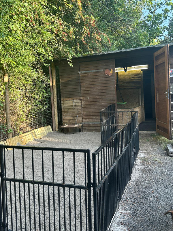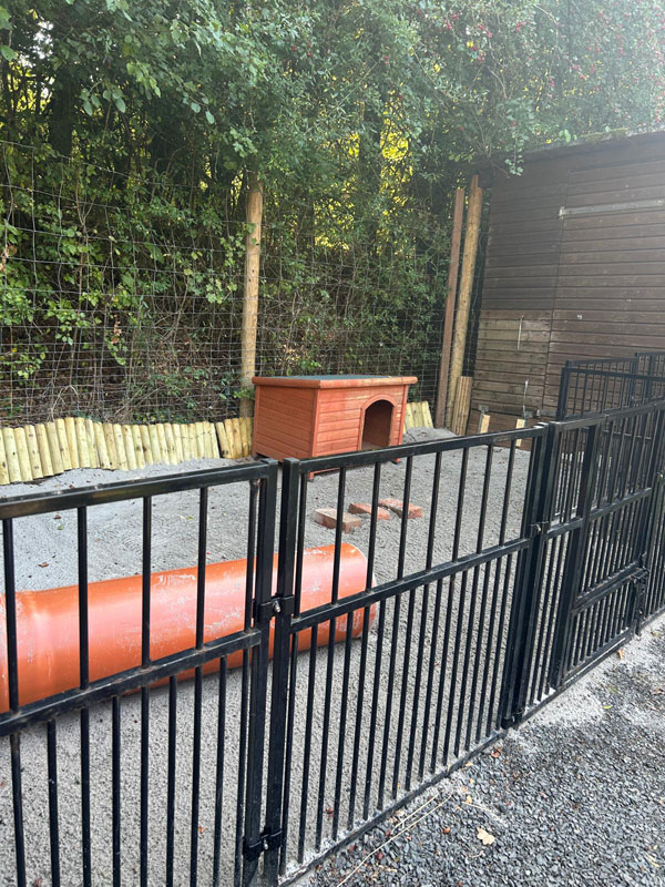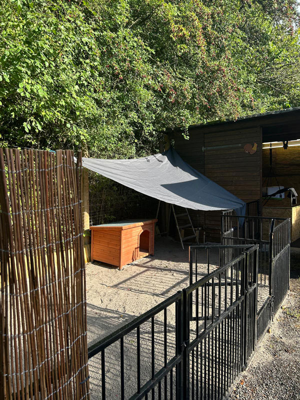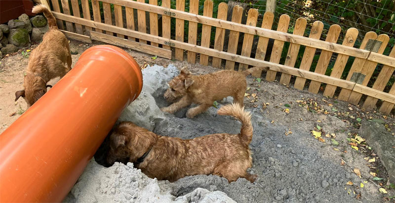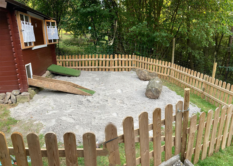 Der Outdoor-Bereich ist geschützt, kann von außerhalb nicht eingesehen werden und flächenmäßig gut ausgelegt. Über eine kleine Tür können die Irish Terrier in den Innenbereich. Zusätzlich steht auf der Fläche noch eine kleine Hundehütte und falls erforderlich, etwa bei fiesem Wetter, kann der Zugangsbereich zum Indoor-Bereich abgedeckt werden.