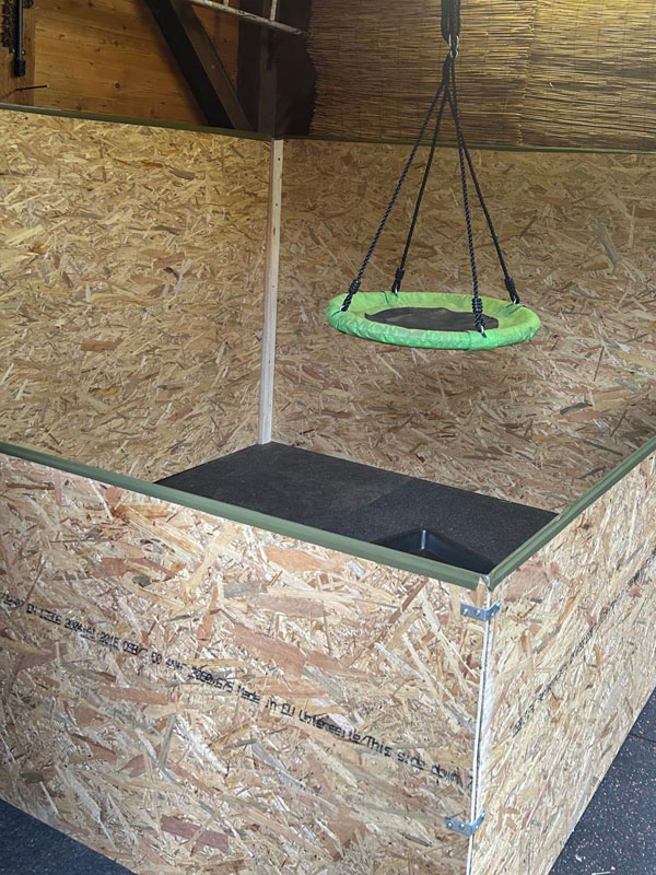 Der indoor-Bereich ist noch nicht ausdekoriert. Er kann beheizt werden und verfügt über ein großes Fenster. Der Zugang zum Außenbereich erfolgt über eine gesicherte Tür.