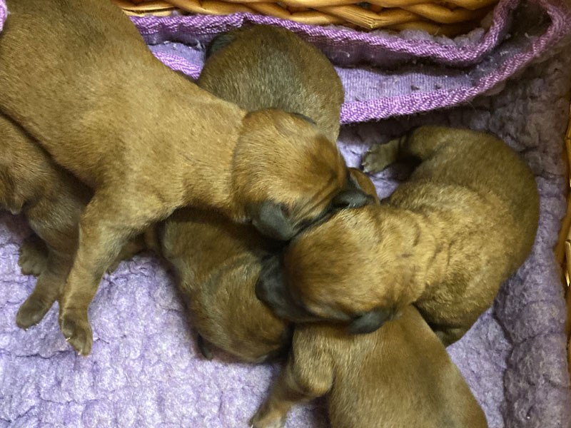 Die erste Lebenswoche liegt nun hinter den Welpen aus unserem B-Wurf. Die Kleinen tun, was Welpen eben so tun, sie nuckeln und schlafen und nuckeln und schlafen. Sie robben herum und schlafen und bedienen sich an der Milchbar. Ira ist sehr instinktsicher und kümmert sich herzig um ihre Welpen. Es ist wichtig, dass die Welpen in den ersten Tagen ordentlich an Gewicht zulegen. Das ist bestens gelungen, nach nicht ganz einer Woche haben sie ihre jeweiligen Geburtsgewichte verdoppelt.
