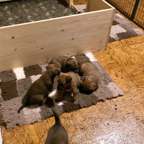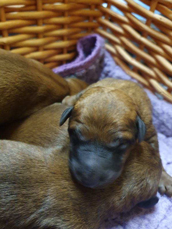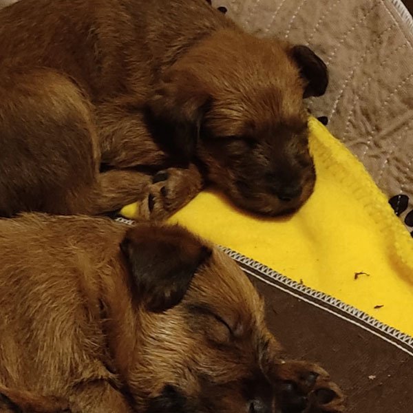 Und schon haben die kleinen McGowan Irish Terrier die zweite Lebenswoche hinter sich gelassen. Schon am neunten Tag blinzelten uns die zwei Mädels an. Am 10. Tag tat ihr Bruder es ihnen nach und ihm folgten die beiden anderen Brüder. Nun sind sie etwas neugieriger und lugen in der kleinen Welt der Wurfkiste herum. Gegen Ende der zweiten Woche haben sie ihre Geburtsgewichte verdreifacht und das sieht man auch. Tollkühn starten sie ihre ersten Gehversuche. Ira hütet und umsorgt die B-Wurflinge wie es sein soll. Highlight war der Besuch unserer Zuchtwartin, die sehr zufrieden mit den Zwergen und unserer Arbeit war.