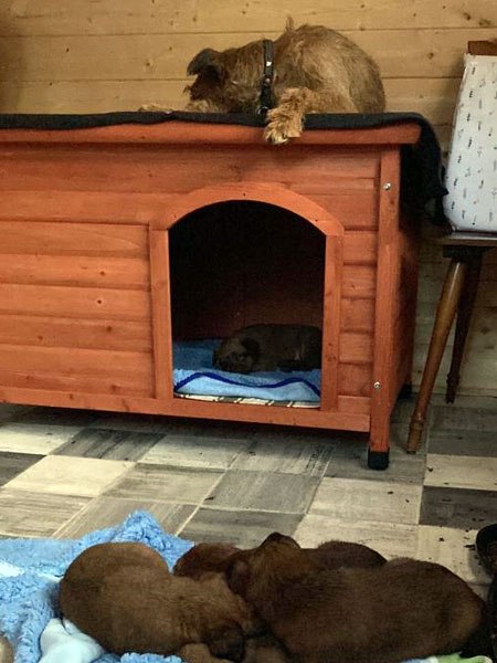 Es ist Halbzeit für die McGowan Welpen. Die fünfte Lebenswoche haben die nun weitaus aktiveren Zwerge souverän absolviert. Das Aktivitätsniveau hat sich deutlich erhöht. Gegen Ende der Woche haben sie dann den ersten Tag im Welpenhaus verbracht. Dort gab es jede Menge Neues zu entdecken. Ira kann das muntere Treiben aus erhöhter Position vom Dach des Häuschens im Häuschen bestens im Auge behalten. Die vielen neuen Eindrücke und Erfahrungen, die die kleinen Irish machen, wollen in Ruhe verarbeitet werden. Das funktioniert im Schlaf am allerbesten.