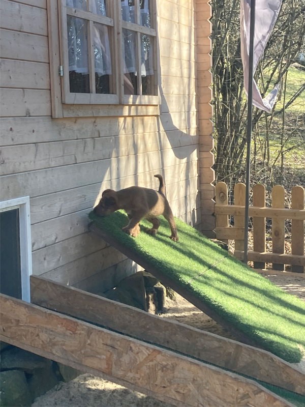 Woche sieben ist geschafft. Die ganze Woche über war prima Wetter. Kalte Nächte und sonnige trockene Tage in Shanewood haben den Welpen viel Spaß und Bewegung an der frischen Luft gebracht. Sie nutzen Welpenhaus und Freilauf nun wie es ihnen gefällt. Sie wissen das Angebot an Spiel- und Tobeoptionen wohl zu nutzen. Immer wieder beliebt ist die Kletterwand, die auch gerne als Rutsche genutzt wird. Mal sehen, vielleicht bauen wir auch das Bällebad auf. Die Frage ist, was bringt den Welpen ein Bällebad. Die Welpen hatten außerdem in dieser Woche Besuch und haben ihre großen Schwestern Frida und Titu kennengelernt. Das fanden sie sehr spannend. Nun geht es mit Riesenschritten in die achte Lebenswoche
