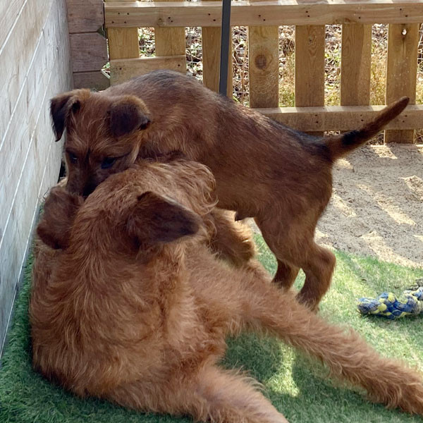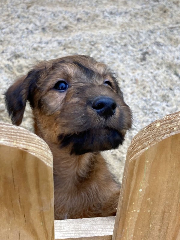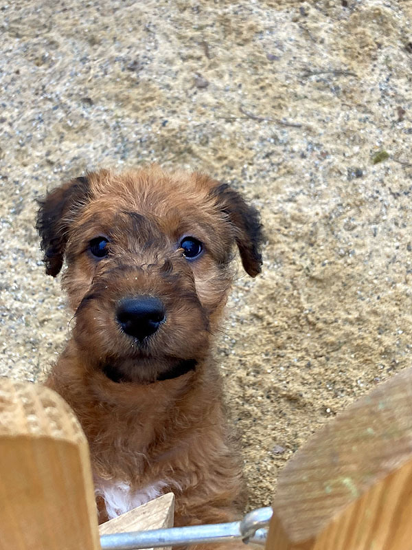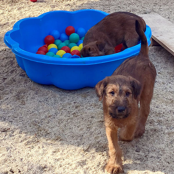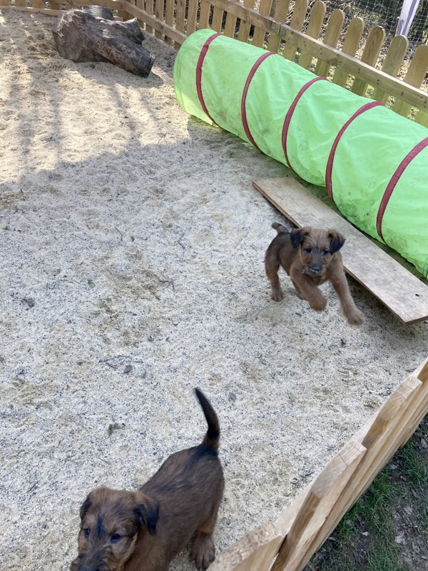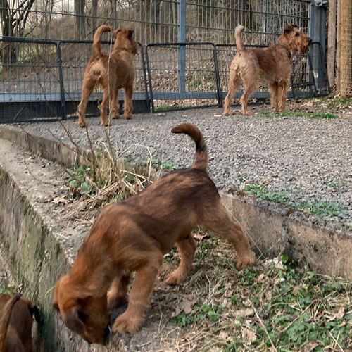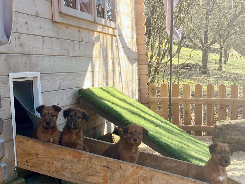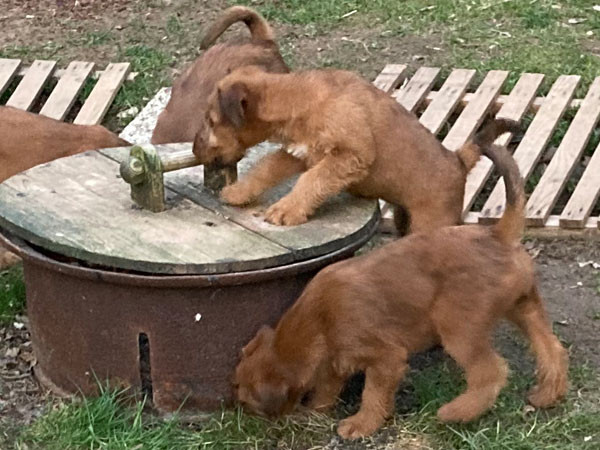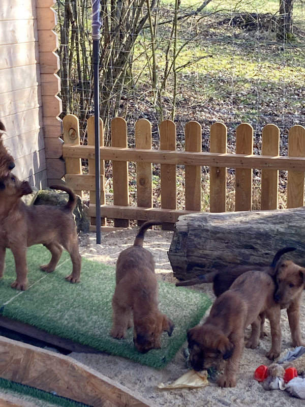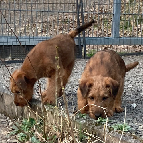 Eine aufregende neunte Lebenswoche liegt hinter den kleinen McGowans. Die ganze Bande ist nun geimpft und gechipt. Herzlichen Dank an unsere Tierärztin für den sehr guten Service. Der Auslauf ist inzwischen zu klein. Die McGowan Welpen nutzen deshalb nun das ganze Grundstück und alles was so rumsteht. Das Gelände ist rundum welpendicht – versteht sich. Denn clever sind sie schon jetzt. Da ist es gut, sicherzustellen, dass da nirgends eine Lücke im Zaun ist. Die Eltern-Irish sind natürlich immer draußen dabei und passen auf. Wachhunde! Irish Terrier sind eben Allrounder. Am Samstag ging es dann auf große Fahrt in den hohen Vogelsberg. Ein Besuch bei Freunden und der großen Schwester. Was für ein Spaß! Und auswärts ist es auch lecker.