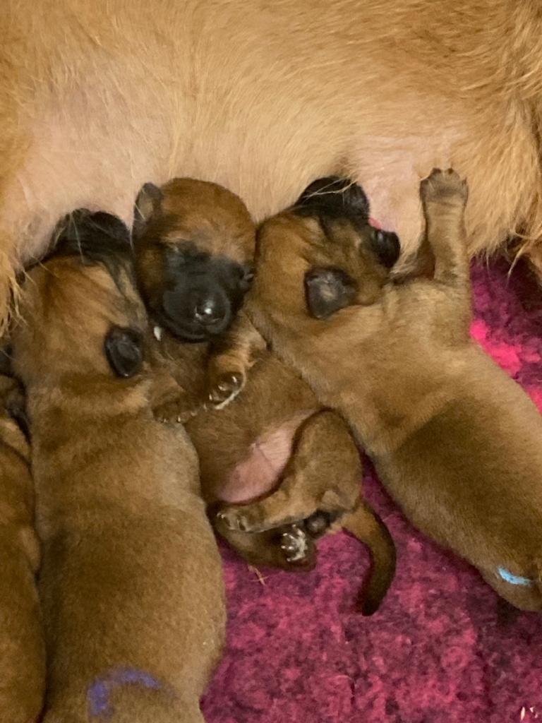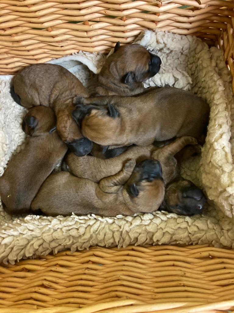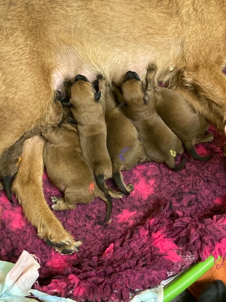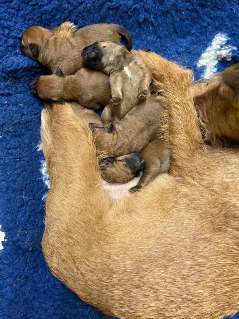 Etwas mehr als zwei Wochen sind nun rum. Die kleinen Irish Terrier entwickeln sich sehr gut. Gegen Ende der letzten Woche haben sie schon munter in die Welt geblinzelt auch die ersten Gehversuche stehen an und sind zu beobachten. Viel Action darf man nicht erwarten, der klare Fokus der Mini McGowans liegt auf Nuckeln und schlafen. Das machen sie richtig gut.