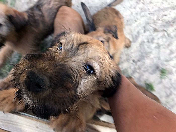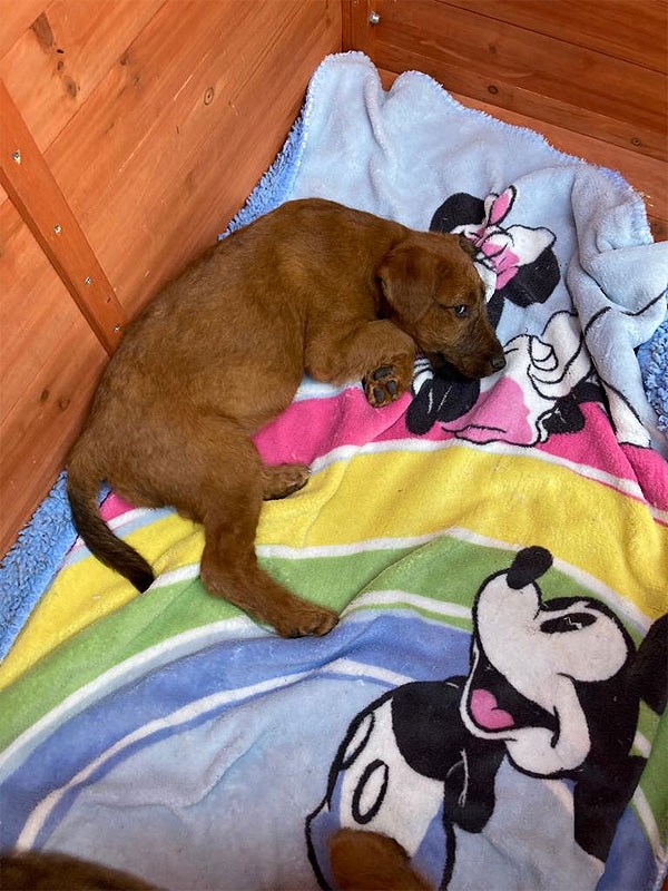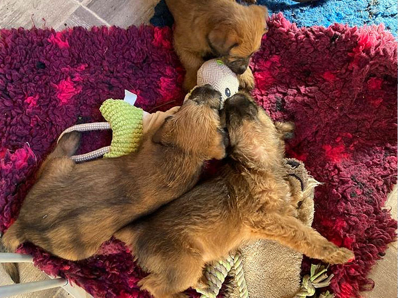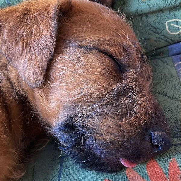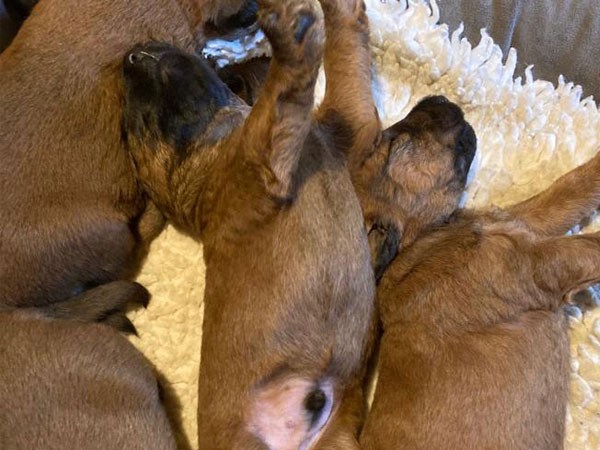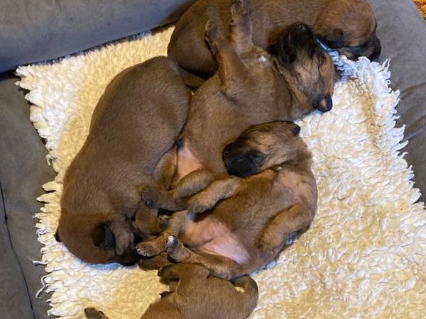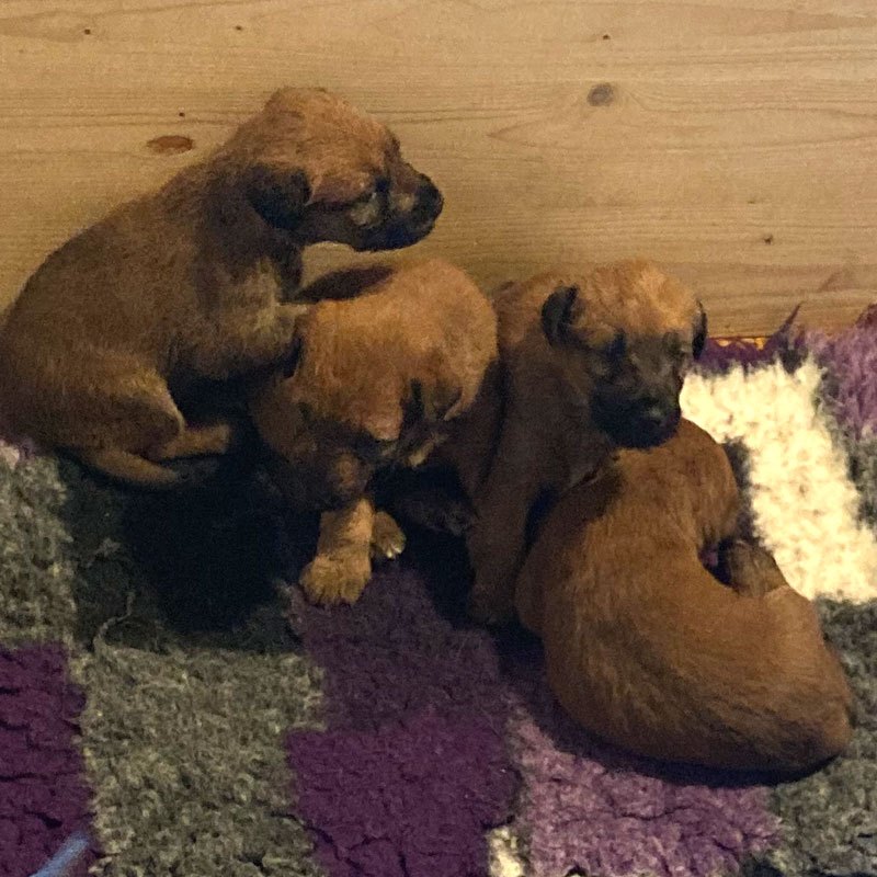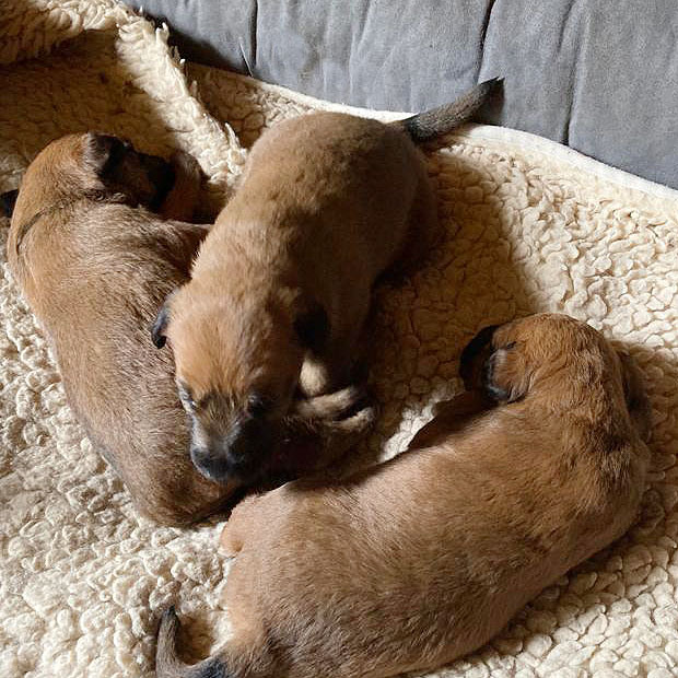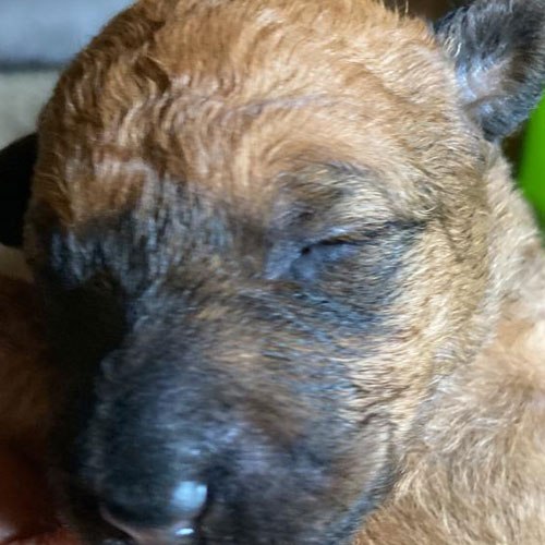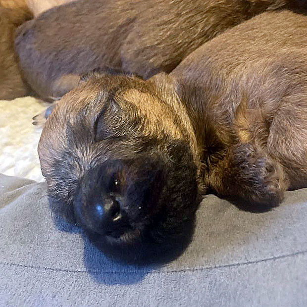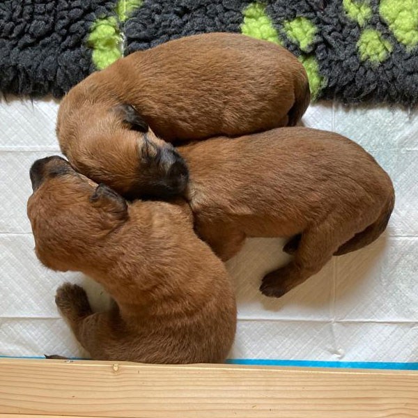Etwas mehr als zwei Wochen sind nun rum. Die kleinen Irish Terrier entwickeln sich sehr gut. Gegen Ende der letzten Woche haben sie schon munter in die Welt geblinzelt auch die ersten Gehversuche stehen an und sind zu beobachten. Viel Action darf man nicht erwarten, der klare Fokus der Mini McGowans liegt auf Nuckeln und schlafen. Das machen sie richtig gut.