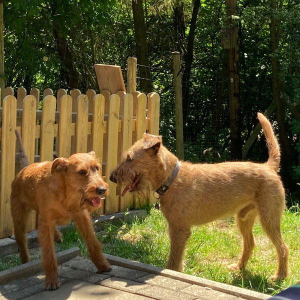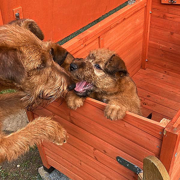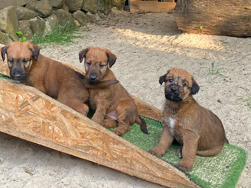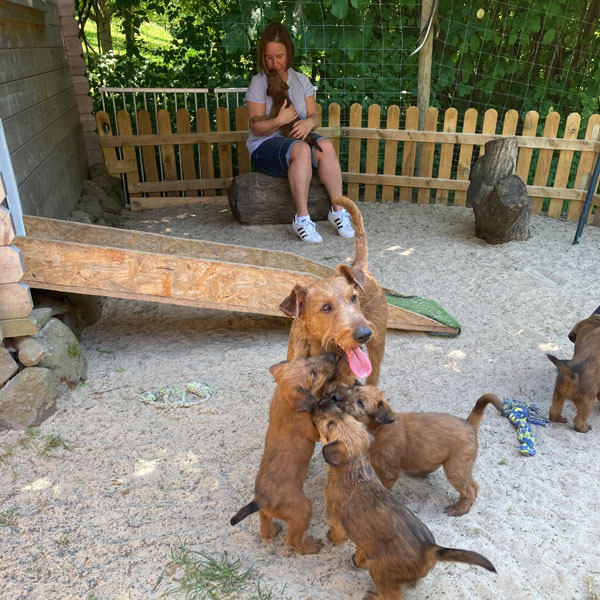 Es ist schön zu sehen, wie sich die Welpen aus dem C-Wurf entwickeln. Sie sind nun den ganzen Tag an der frischen Luft und das wunderbare Wetter in Shanewood macht das möglich. In dieser Woche waren die ersten Besucher bei uns und alle hatten einen Heidenspaß. Das Aktivitätsniveau der kleinen Irish Terrier hat sich mächtig entwickelt, sie sind quirlig, raufen, spielen und lernen jetzt schon eine ganze Menge. Ira die Mutterhündin und Bantry die Halbschwester der Zwerge kümmern sich wunderbar.