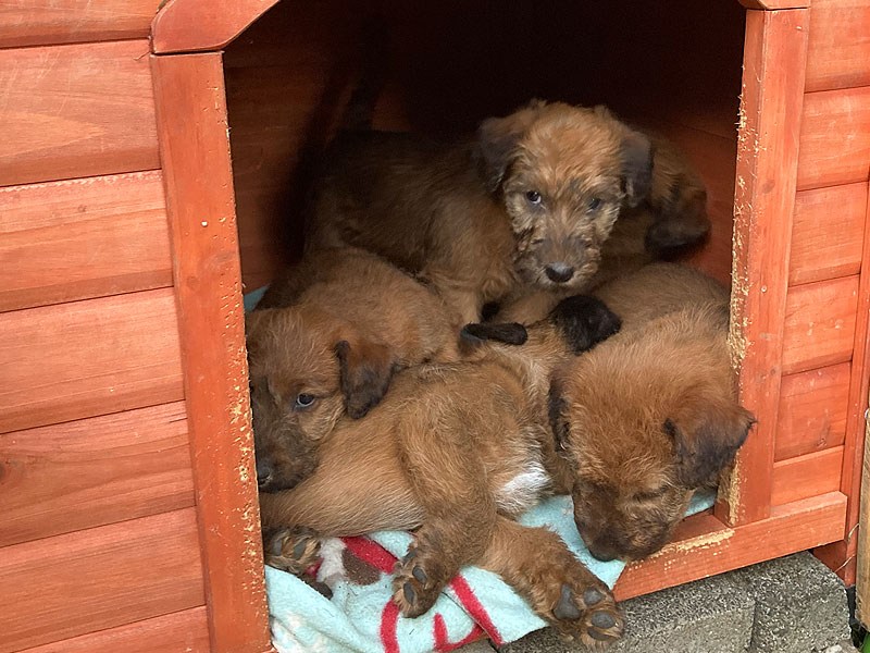 Wir freuen uns über den gelungenen C-Wurf. Aus der interessanten Verpaarung aus Fireflash Foo Fighter mit unserer Hündin Fireflash Ira McGowan kamen am 19. April 2023 sechs kleine Irish Terrier Welpen zur Welt. Nun steht die wunderbare Zeit der Aufzucht von drei kleinen Irish Terrier Rüden und drei ebenso kleinen Hündinnen an. Trächtigkeit und Geburt verliefen problemlos, die kleinen Irish Terrier sind gesund, munter und sehr homogen. Wir sind nun sehr gespannt wie sich die C.CHEN entwickeln.
