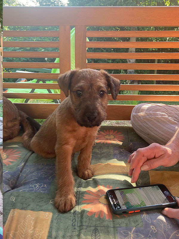 Aufregend wurde es dann in der neunten Lebenswoche. Für die Zwerge aus dem C-Wurf und für uns, die freundlichen Züchter der Rasselbande. Auf dem Plan stand der Besuch auf der Emsmühle zur Nachzuchtkontrolle durch Hans E. Grüttner. Das ist immer ein Highlight kurz vor dem Auszug der Welpen. Hans E. Grüttner nimmt sich viel Zeit und sieht sich jeden Welpen in Ruhe und hinreichend kritisch an und gibt uns ein überaus sachverständiges Feedback zu den kleinen Irish Terriern aus unserer Zucht. Wir sind mit dem Ergebnis sehr zufrieden und wir können wohl sagen, dass wir züchterisch auf einem guten Weg sind. Herzlichen Dank, lieber Hans!