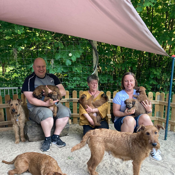 Und hier sind sie nun die Happy Few mit ihren McGowan Irish Terriern: Paula, Harry, Connor, Cony, Gemma und Ciwa